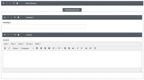 - You have a similar example as the first one but you also need some set fields for the wrapper. For example, your design may call for a background image and some heading text but the content could be open-ended in the wrapper. With the Parent attribute, you can create a Content Builder element with three fields, a text box for the heading, an image upload field, and a Parent field. You then have the flexibility to put any other element within the Parent container to build out your content.