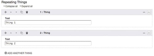 A Repeating Fields attribute allows you to create a set of fields that can be repeated when editing a page or app item.