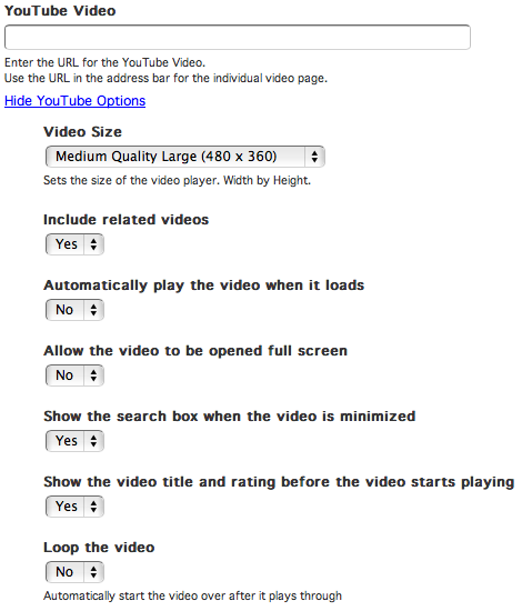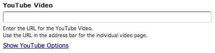 The YouTube Video field allows you to output a YouTube Video player in your content. A YouTube Video field requires only the URL of the YouTube video's page.
